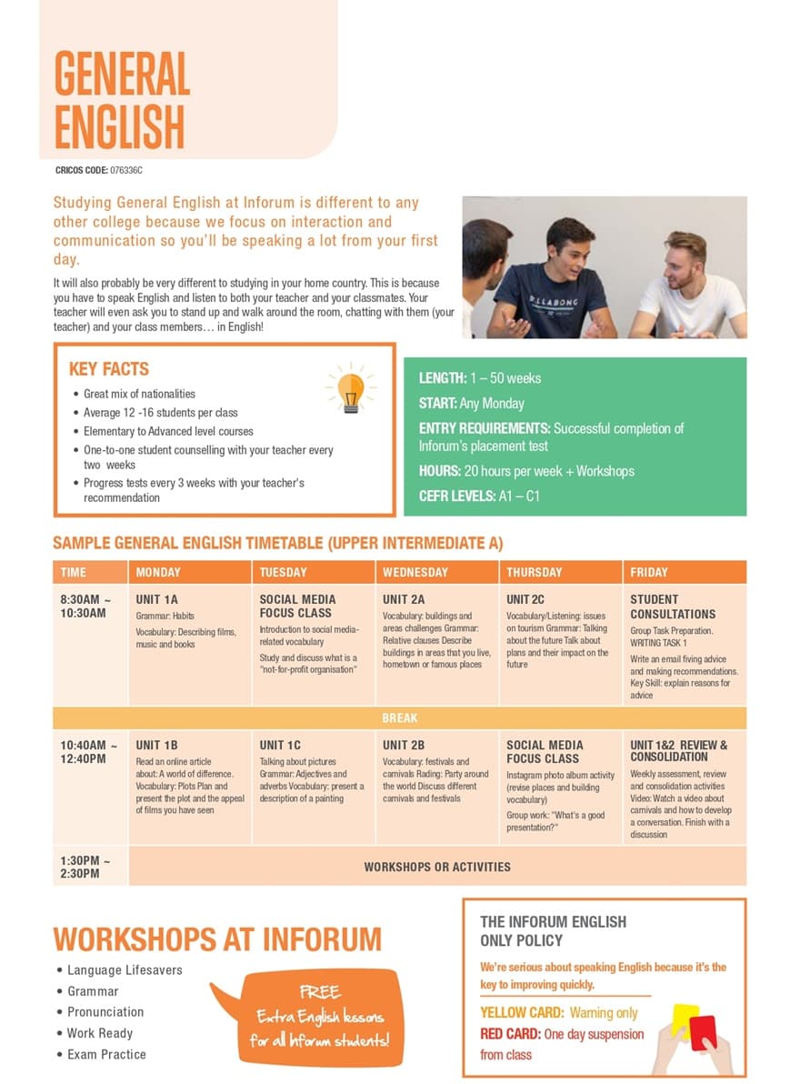 Inforum Education 成立於 2007 年,是一所位於澳洲黃金海岸的優質語言學校,擁有親切熱情的行政團隊與經驗豐富、具專業認證的師資陣容,致力於協助每位學生實現語言學習的目標,並在海外生活中獲得豐富且寶貴的經驗。校區位於 Southport(南港)市中心,地理位置優越,步行 5 分鐘即可抵達銀行、郵局、圖書館、電車站、餐廳等各類生活設施。Inforum 最大的特色在於重視「互動式教學」與「即時溝通能力」的培養,學生從第一天起即大量參與口語練習,不再只是被動學習,而是透過實際運用語言,逐步建立溝通自信;教師亦會引導學生互動、進行分組討論,甚至在課堂中走動交流,讓學生以全英文的方式進行自然、生活化的語言學習,真正打造沉浸式的學習體驗。