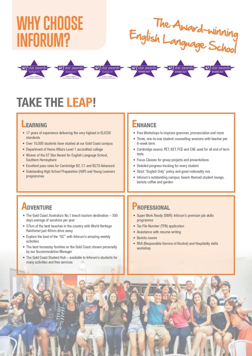 - 榮獲2023及2024年「ST Star Award」南半球最佳英語語言學校獎項