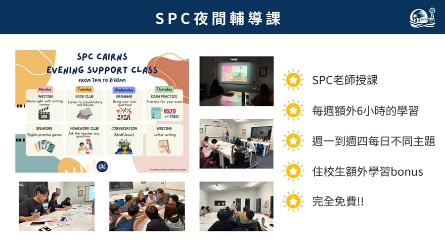 陽光太平洋學院 Sun Pacific College(SPC)共設有兩大校區,其中凱恩斯主校區為獨立校園,設備完善,包括網球場、籃球場、迷你高爾夫球場、游泳池、餐廳及校內宿舍,並鄰近凱瓦拉海灘(Kewarra Beach),步行即可抵達珊瑚海沿岸沙灘、當地商店與公車站,地理位置相當優越。主校區重視全英語學習環境並實施 English Only Policy,讓學生沉浸於純正英語情境,有效提升語言能力;校園氛圍友善多元,結合自然景觀與多元文化,非常適合希望專注學習的學生。入住校內宿舍不僅能降低生活成本,也能與來自世界各地的同學建立深厚友誼,體驗獨特且充實的國際學習生活;宿舍全年 365 天提供三餐並安排夜間輔導課程,因此深受學生喜愛。布里斯本校區則位於市中心,步行數分鐘即可抵達公車、火車及渡輪站。課程主要安排於白天,學生可在課後彈性安排打工或探索城市,不僅享有都市生活的便利,也能沉浸在多元文化與全英語的學習環境中,是結合語言學習、升學銜接與生活體驗的理想選擇。