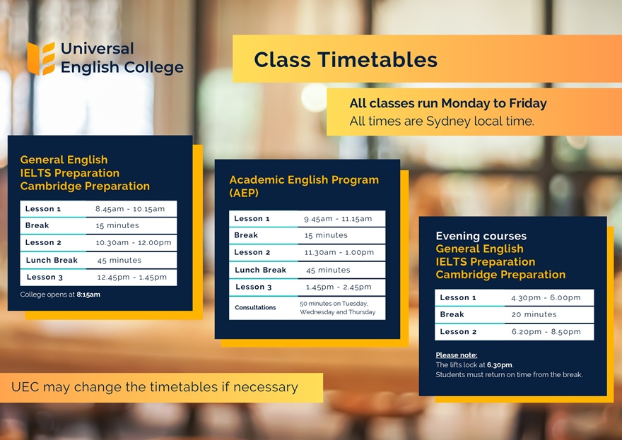 Universal English College(UEC)成立於 1988 年,是澳洲歷史最悠久的私立 ELICOS 語言學院,近 35 年來持續幫助來自全球的學生實現英語學習、學業、旅遊與職涯的夢想。UEC 校區位於雪梨熱鬧的市中心 Clarence 街 203 號,地理位置極為便利,從 Town Hall 或 Wynyard 火車站步行僅需 5 分鐘,無論搭乘火車、公車或輕軌都能輕鬆抵達。校區周邊交通選擇多樣,咖啡館、商店及各式生活服務近在咫尺,讓你上課與享受城市生活都前所未有地便利。