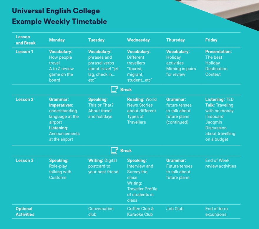 UEC 的學生組成多元,來自世界各地,擁有豐富的文化背景,為你拓展國際視野提供了絕佳機會。以開放心態勇於交流、主動探索不同文化,將讓你的遊學旅程更加充實而精彩。若對自身的英語程度感到不確定,隨時可與老師討論;UEC 會依據文法、詞彙、口說、聽力、閱讀、流暢度與準確性等多項指標進行分班與調整,確保你始終在最適合的學習環境中成長與進步。