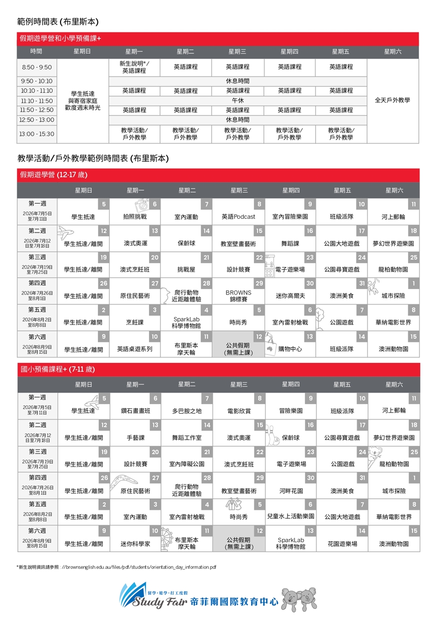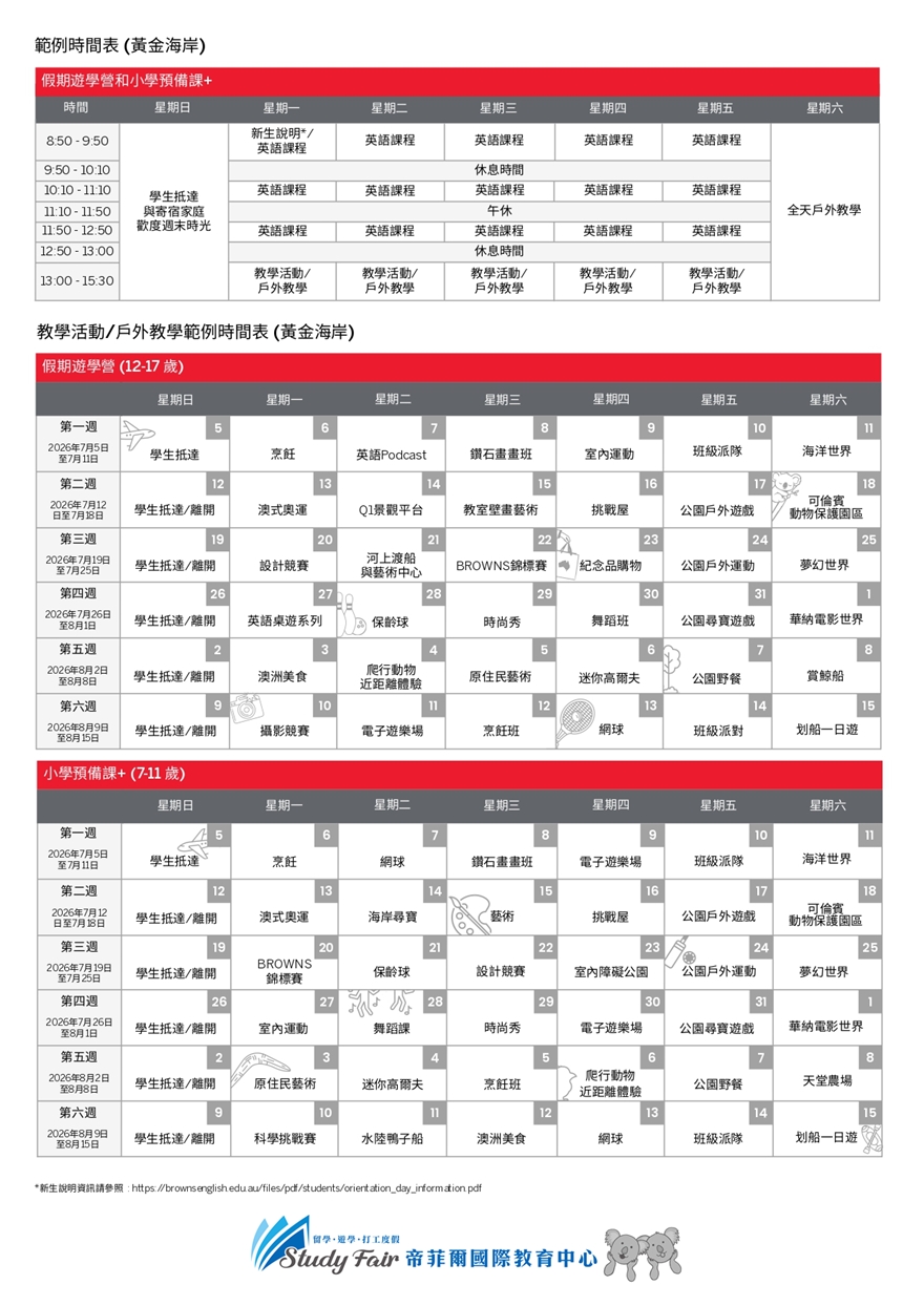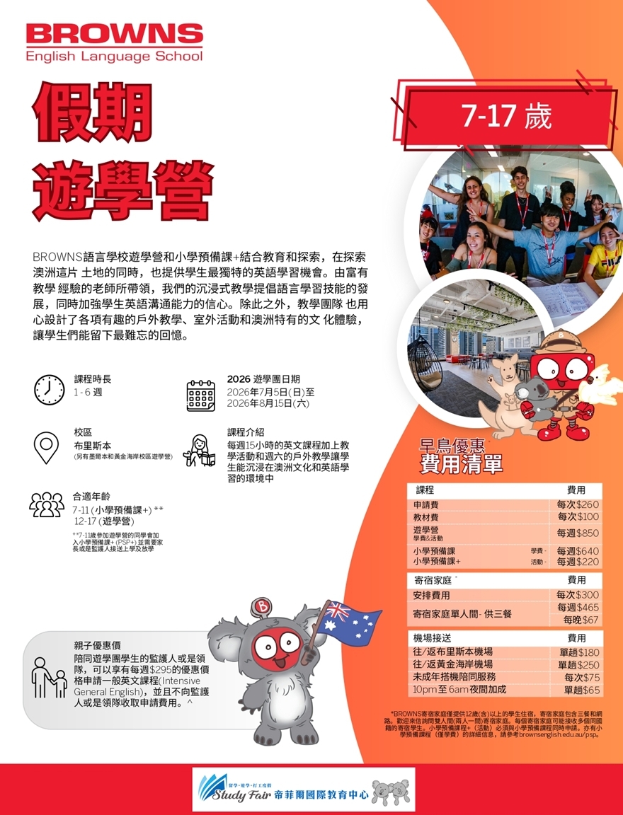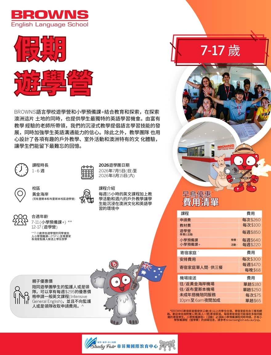 BROWNS 語言學校青少年假期遊學營(JHP)與小學預備課程+活動(PSP+)結合多元學習與探索體驗,讓學生在深入感受澳洲這片土地的同時,享有獨特且高品質的英語學習機會。課程由具備豐富教學經驗的專業師資團隊帶領,透過沉浸式教學模式,全面培養學生的語言學習能力,並有效提升英語溝通自信;同時精心規劃多樣化的戶外教學、室內外活動及澳洲獨有的文化體驗,讓學生在學習之餘拓展國際視野,並留下難忘而珍貴的回憶。