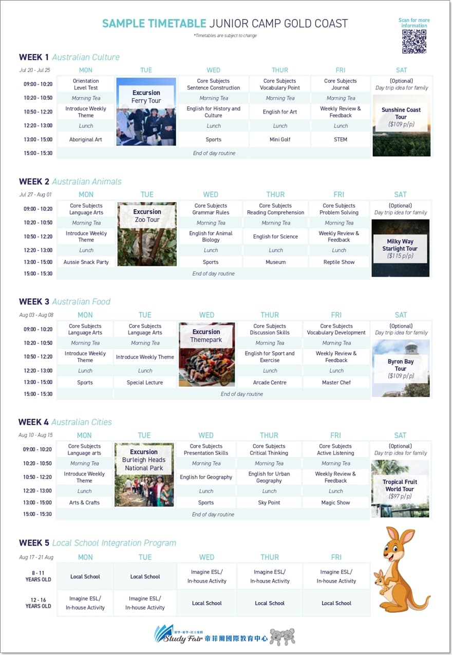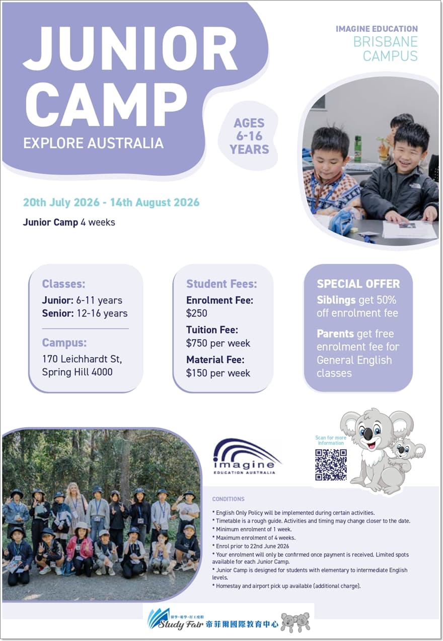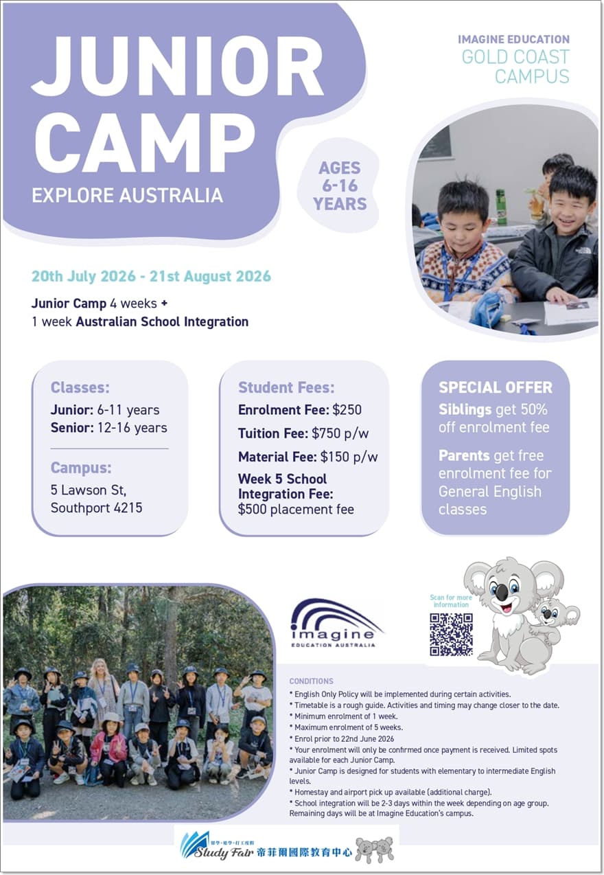 在 Imagine Education,我們深信幼兒與青少年教育對每位孩子的成長與未來成功至關重要。Imagine Education 的青少年英語課程(Junior English Program)於黃金海岸市區及布里斯本市中心開設,適合 6 至 16 歲學生參加。課程內容緊密銜接澳洲昆士蘭州學校課綱,特別適合希望體驗澳洲學校生活的學生。