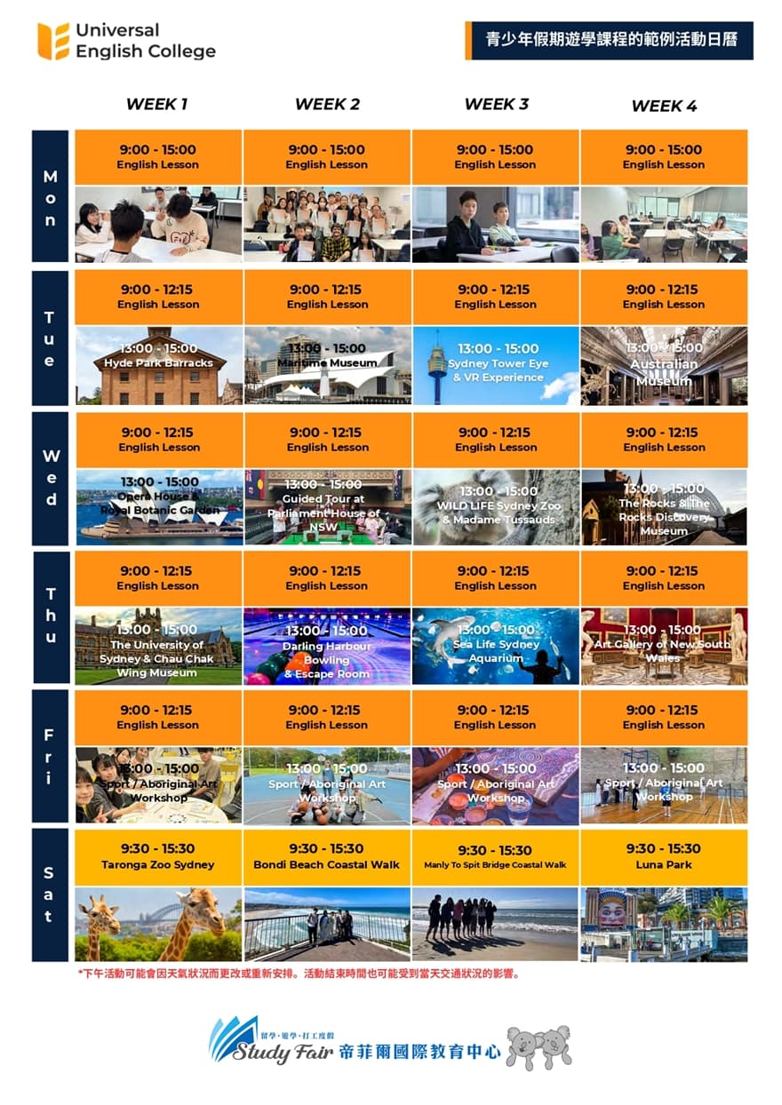 ※ 每週17小時英語課程 + 豐富有趣的戶外活動 + 每週六全天遊覽澳洲著名景點