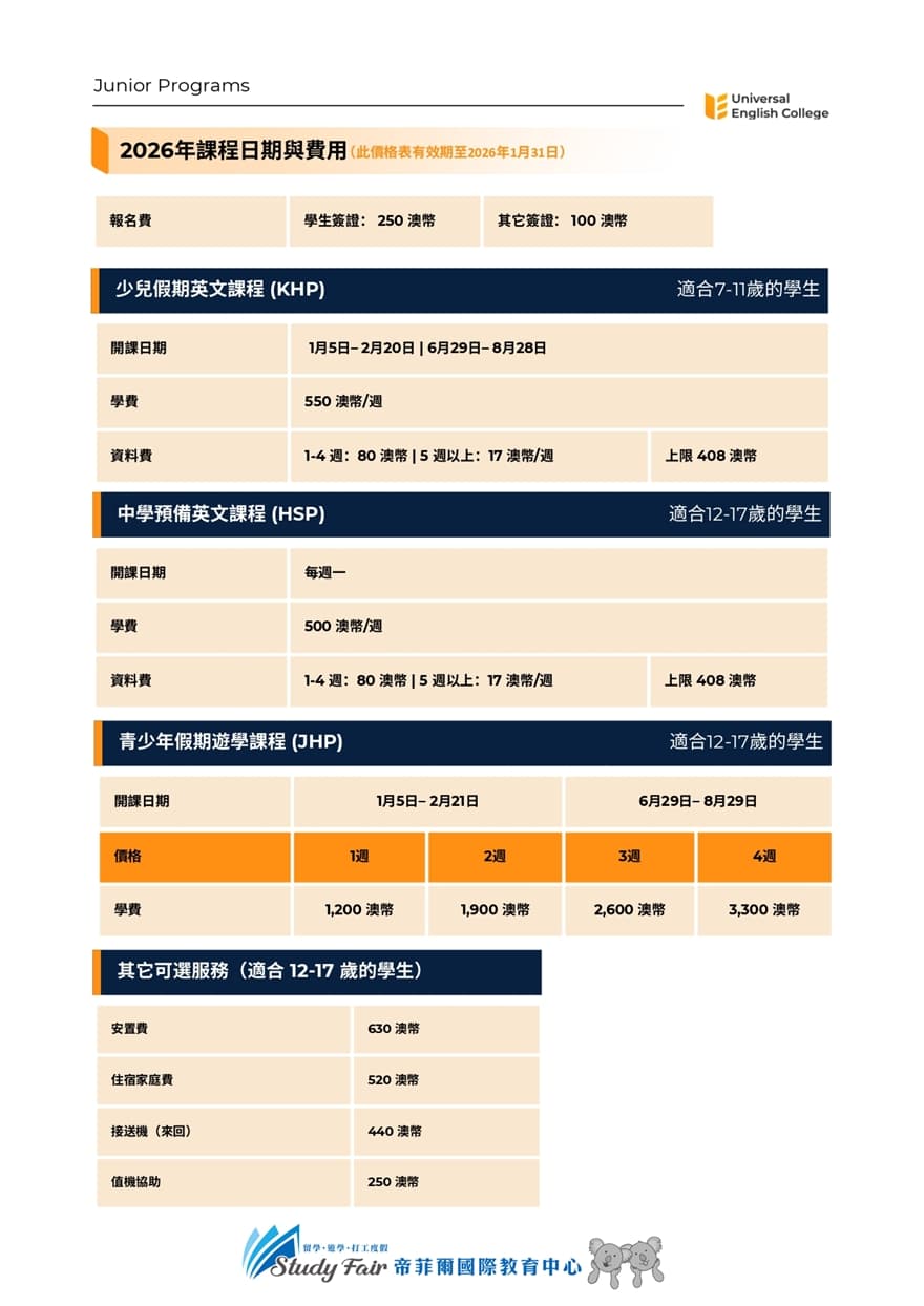 • 寄宿家庭食宿費:$520/週(單人房,含三餐)