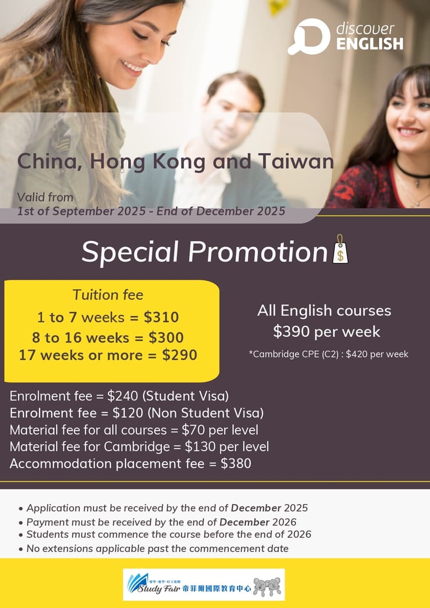 ➤ 持觀光簽證或打工度假簽證者可享優惠註冊費 $120 - 學費:$390/週