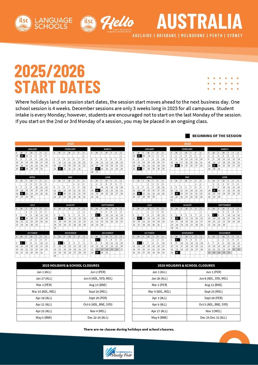 適用於 ILSC 阿得雷德、布里斯本及伯斯校區的所有課程時段。
