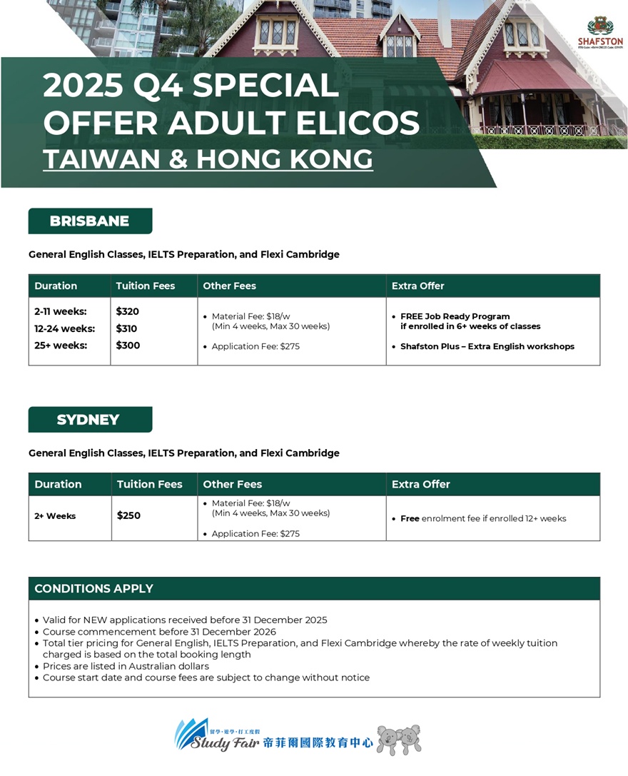 - 布里斯本校區限定優惠(報名課程滿 6 週以上)