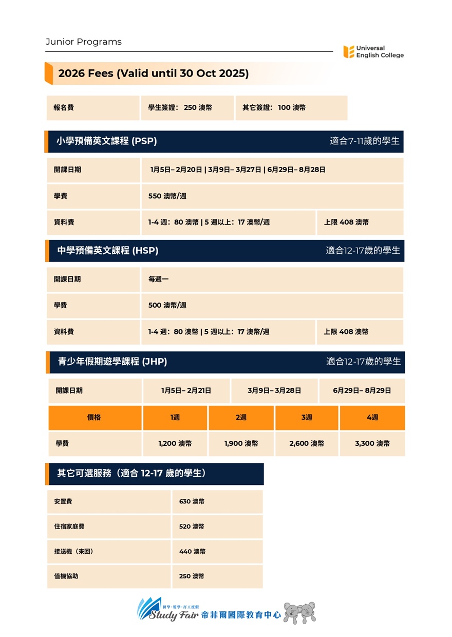 (中小學預備課程學生與非學生簽證持有者可享優惠價 $100) - 教材費:每週 $17,最低收取 $80
