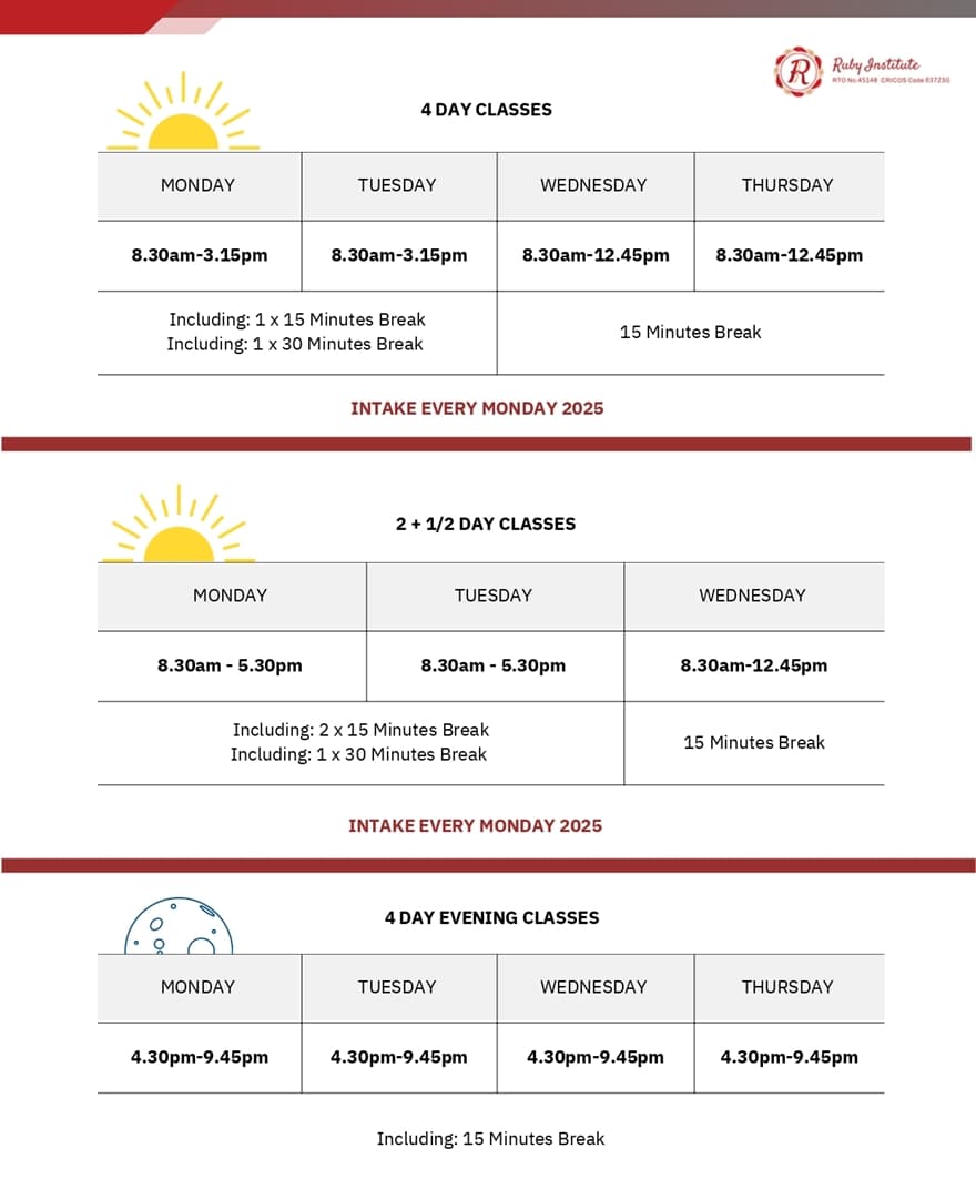 Ruby Institute 不僅提供完善的培訓與評估計畫,更致力於營造支持性與包容性的學習環境,讓每位學生都能自在學習、穩定成長。學校準備豐富且合適的學習資源,課程由具備專業資格與豐富教學經驗的培訓師親自授課,並提供個人化的學生支援服務,貼心協助學生在整個學習旅程中解決各種問題;校區位於墨爾本市中心(CBD),環境舒適友善,同時提供具競爭力的課程費用,讓學生能在優質的學習環境中專心追求卓越。